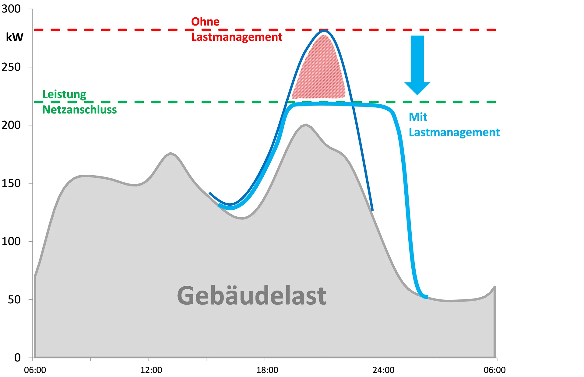 Die Grafik zeigt exemplarisch die Erhöhung der Gebäudelast durch E-Mobilität „Ohne Lastmanagement“ und „Mit Lastmanagement“.