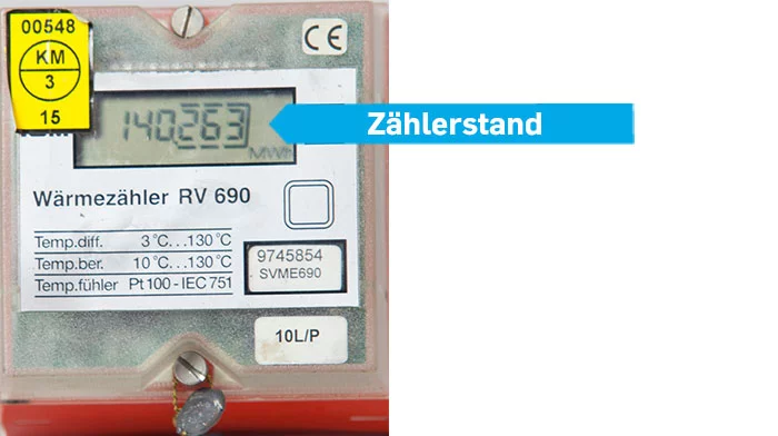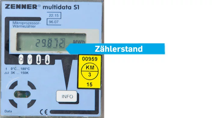 Drücken Sie einmal kurz die Infotaste unterhalb des Displays und es erscheint der aktuelle Zählerstand in MWh mit eingerahmten Nachkommastellen. Durch ein weiteres kurzes Drücken gelangen Sie zu dem aktuellen Zählerstand in m³ mit eingerahmten Nachkommastellen.